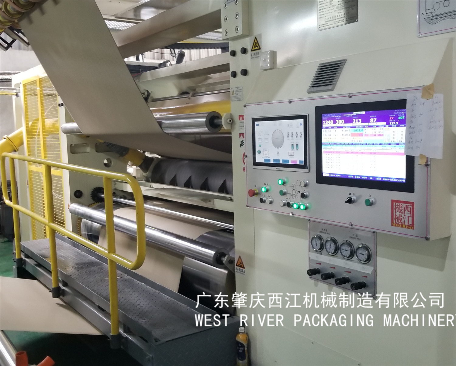 (5). The gap between the pressure roller and the corrugated roller is adjusted by the independent servo push rod at both ends, and the gap is automatically adjusted by changing the corrugated type. The gap control by the system for different flutes, paper and speed adjustment under WEST RIVER Cruise control system.